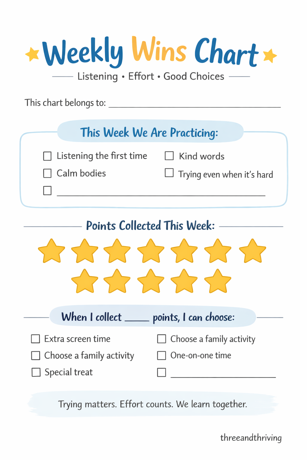 Instead of relying on repeated reminders or reacting in the moment, I use a Weekly Wins rewards chart to reinforce listening and effort.